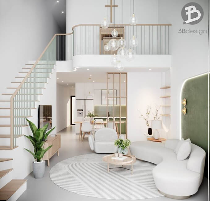 Tủ bếp màu trắng sáng tạo không gian tươi mới. Phòng khách nổi bật với sofa trắng độc đáo, thảm họa tiết và bàn trà tròn nhỏ gọn. Kệ tivi treo tường tiết kiệm diện tích, cây xanh mang lại không khí trong lành. Cầu thang gỗ với lan can sắt sơn tĩnh điện tạo cảm giác nhẹ nhàng, trong khi đèn thả trần làm điểm nhấn ấn tượng.
